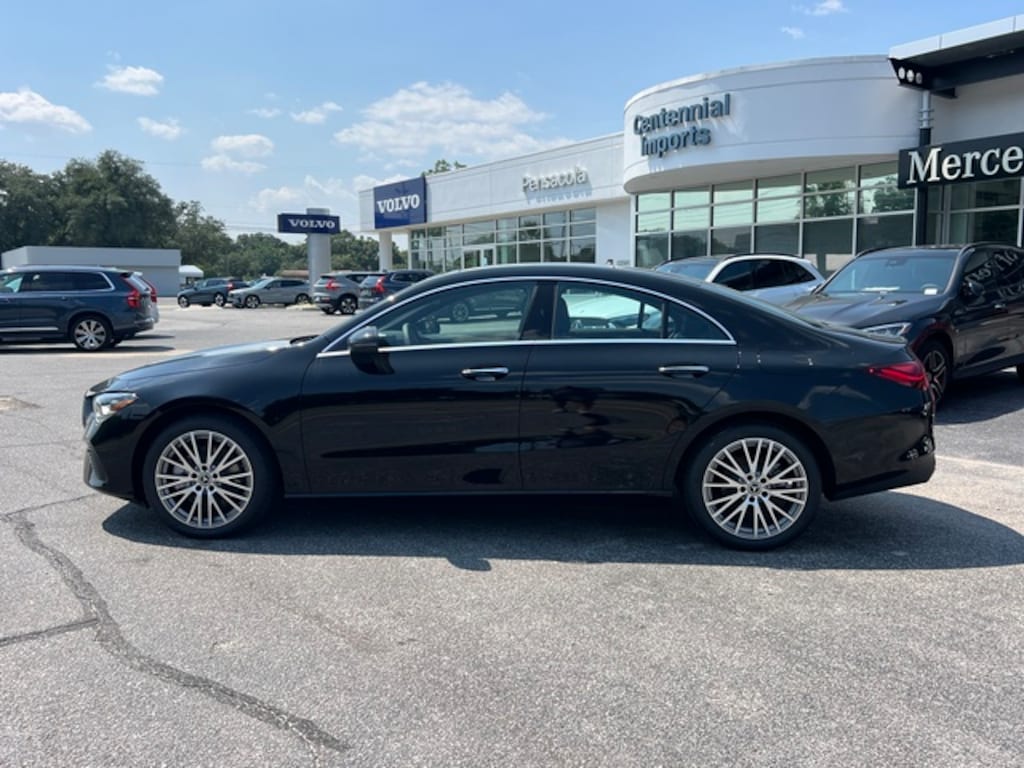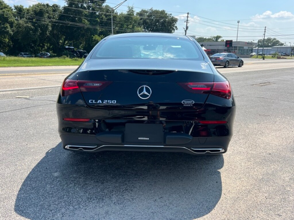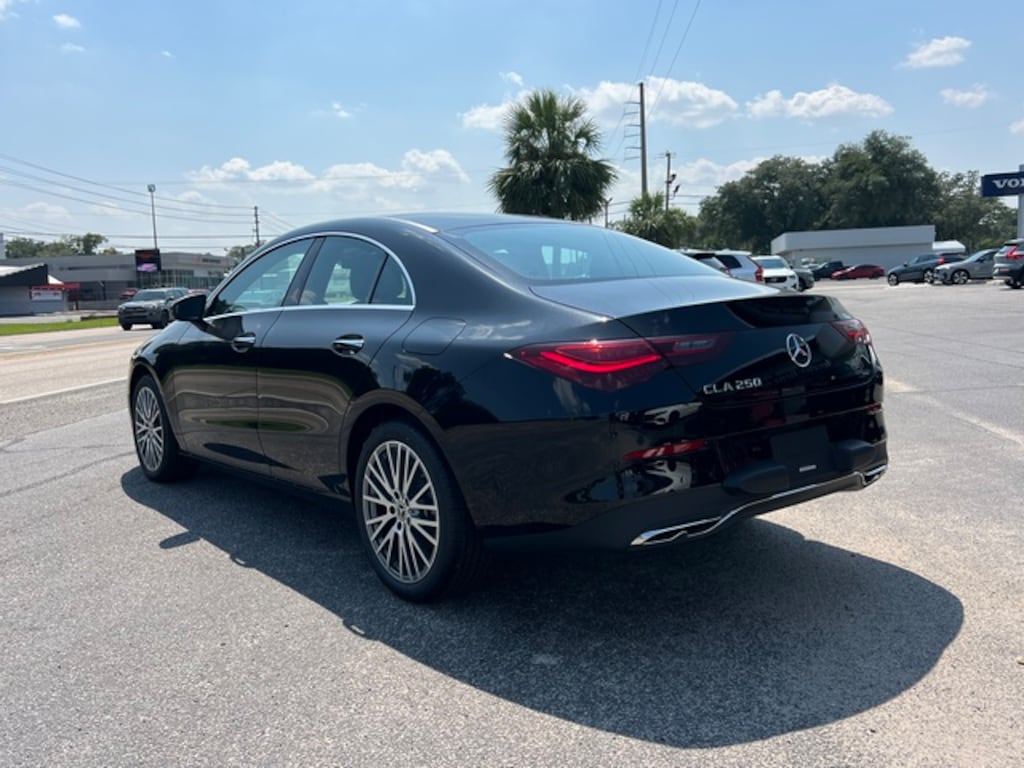 Black 2025 Mercedes-Benz CLA CLA 250 FWD 8 Speed Dual Clutch 2.0L I4 Turbocharged 18" Multi-Spoke Alloy Wheels, 4-Wheel Disc Brakes, 8 Speakers, 8-Way Power Adjustable Driver & Passenger Seats, ABS brakes, Air Conditioning, Alloy wheels, AM/FM radio: SiriusXM, Apple CarPlay®/Android Auto®, Auto High-beam Headlights, Auto-dimming Rear-View mirror, Automatic temperature control, Brake assist, Brushed Aluminum Interior Trim, Bumpers: body-color, Child-Seat-Sensing Airbag, Delay-off headlights, Driver door bin, Driver vanity mirror, Dual front impact airbags, Dual front side impact airbags, Electronic Stability Control, Emergency communication system: eCall Emergency System, Exterior Parking Camera Rear, Four wheel independent suspension, Front anti-roll bar, Front Bucket Seats, Front Center Armrest, Front dual zone A/C, Front reading lights, Fully automatic headlights, Garage door transmitter, Heated door mirrors, Illuminated entry, Knee airbag, Leather steering wheel, Low tire pressure warning, MB-Tex Upholstery, Memory seat, Occupant sensing airbag, Outside temperature display, Overhead airbag, Overhead console, Panic alarm, Passenger door bin, Passenger vanity mirror, Power door mirrors, Power driver seat, Power moonroof, Power passenger seat, Power steering, Power windows, Radio data system, Radio: MBUX Multimedia System, Rain sensing wipers, Rear anti-roll bar, Rear fog lights, Rear reading lights, Rear seat center armrest, Rear window defroster, Remote keyless entry, Security system, SiriusXM Satellite Radio, Speed control, Speed-sensing steering, Split folding rear seat, Steering wheel mounted audio controls, Tachometer, Telescoping steering wheel, Tilt steering wheel, Traction control, Trip computer, Turn signal indicator mirrors, and Variably intermittent wipers.