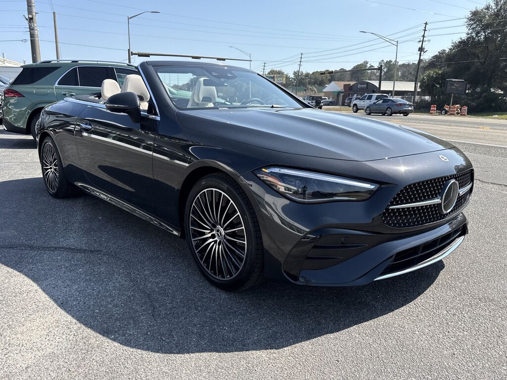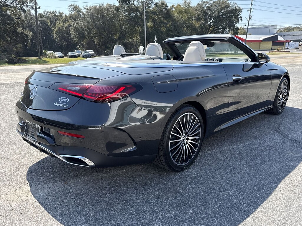 Gray 2026 Mercedes-Benz CLE CLE 300 4MATIC® 4MATIC® 9-Speed Automatic I4 I4, 11.9" Center Touchscreen Display, 17 Speakers, 3 USB C-Ports, 4-Wheel Disc Brakes, ABS brakes, Air Conditioning, Alloy wheels, AM/FM radio: SiriusXM w/360L, Apple CarPlay®/Android Auto®, Auto High-beam Headlights, Auto tilt-away steering wheel, Auto-dimming door mirrors, Auto-dimming Rear-View mirror, Automatic temperature control, Brake assist, Bumpers: body-color, Compass, Convertible roof lining, Convertible roof wind blocker, Delay-off headlights, Driver door bin, Driver vanity mirror, Dual front impact airbags, Dual front side impact airbags, Electronic Stability Control, Emergency communication system: Mercedes-Benz Emergency Call Service, Exterior Parking Camera Rear, Four wheel independent suspension, Front anti-roll bar, Front Bucket Seats, Front Center Armrest, Front dual zone A/C, Front reading lights, Fully automatic headlights, Garage door transmitter: HomeLink, Genuine wood dashboard insert, Glass rear window, HD Radio, Head restraints memory, Heated door mirrors, Heated Front Seats, Heated front seats, Illuminated entry, Integrated roll-over protection, Knee airbag, Leather steering wheel, Low tire pressure warning, MB Navigation, MB-Tex Seat Trim, Memory seat, Navigation system: MBUX, Occupant sensing airbag, Outside temperature display, Overhead airbag, Overhead console, Panic alarm, Passenger door bin, Passenger vanity mirror, Power adjustable front head restraints, Power convertible roof, Power door mirrors, Power driver seat, Power passenger seat, Power steering, Power windows, Radio data system, Radio: 3rd Generation MBUX Multimedia System, Rain sensing wipers, Rear anti-roll bar, Rear fog lights, Rear window defroster, Remote keyless entry, Security system, SiriusXM Satellite Radio, Speed control, Speed-sensing steering, Split folding rear seat, Steering wheel memory, Steering wheel mounted audio controls, Steering Wheel Shift Paddles, Tachometer, Telescoping steering wheel, Tilt steering wheel, Traction control, Trip computer, Turn signal indicator mirrors, Variably intermittent wipers, Wheels: : 18" x 8.0J 5-Twin-Spoke Black, Wireless Android Auto®, and Wireless Apple CarPlay®. I4.