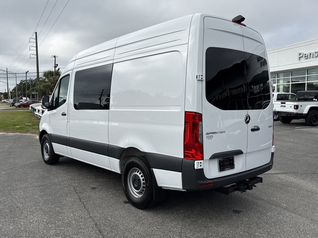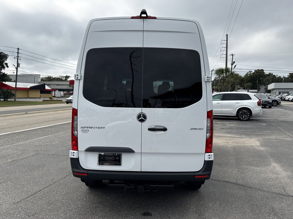 White 2026 Mercedes-Benz Sprinter 2500 Crew 144 WB RWD 9-Speed Automatic 2.0L 4-Cylinder 16" x 6.5J Steel Wheels, 3.923 Axle Ratio, 4-Wheel Disc Brakes, 5 Speakers, ABS brakes, Air Conditioning, AM/FM radio, Armrest For Driver's Seat, Armrest For Front Passenger Seat, Bodyside moldings, Brake assist, Driver door bin, Driver's Seat Mounted Armrest, Dual front impact airbags, Dual front side impact airbags, Electronic Stability Control, Emergency Call System, Emergency communication system, Exterior Parking Camera Rear, Fabric Maturin Upholstery, Front anti-roll bar, Front Bucket Seats, Front wheel independent suspension, Fully automatic headlights, Heated door mirrors, Heated Driver's Seat, Heated front seats, Illuminated entry, Low tire pressure warning, Outside temperature display, Overhead airbag, Overhead console, Passenger door bin, Passenger seat mounted armrest, Power door mirrors, Power steering, Power windows, Radio: Standard, Rain sensing wipers, Rear anti-roll bar, Rear window defroster, Remote keyless entry, Speed control, Standard Driver Seat, Standard Front Passenger Seat, Steering wheel mounted audio controls, Tachometer, Tilt steering wheel, Traction control, and Variably intermittent wipers.